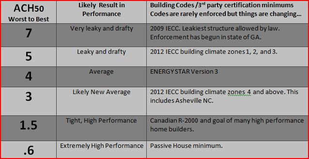 ACH50 is the most common way of expressing airtightness measurements. Its the home's air changes per hour, at 50 pascals of pressure, the rough equivalent to a 20 mile per hour wind. This table is our interpretation of various code and certification levels for this measurement of hidden craftsmanship and quality.